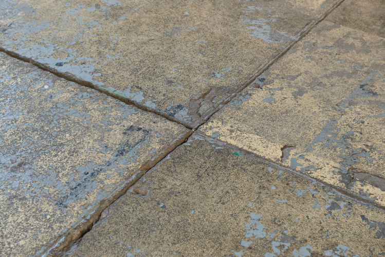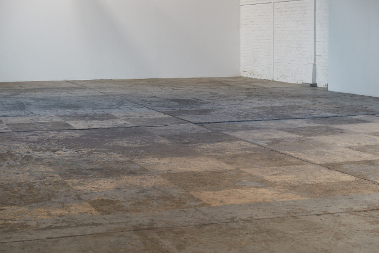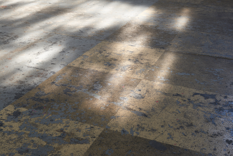 Sol peint selon le plan du lieu annoté et corrigé par Joseph Spinelli, régisseur et Magalie Meunier, assistante commissaire à l’Institut d’art contemporain de Villeurbanne. Miroirs et courriers posés au sol : Éléonore Pano-Zavaroni.