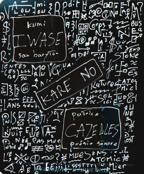 KARE NO : La rencontre de Kumi Iwase (saxophone baryton) et de Patrice Cazelles (poésie sonore) s’est faite autour des « radiographies sonores ». Ces glyphes abstraits sont « écrits » en direct lors de concerts de musique expérimentale. Ils sont ensuite reproduits sur d’anciennes radiographies. Cette trame graphique, genre de partition, héberge les énergies ressentis dans les concerts. La voix et le son du saxophone restituent librement ces intensités.